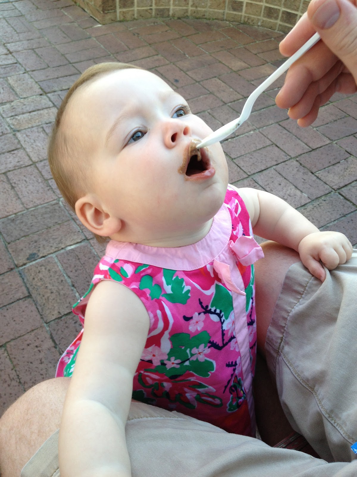 And here's some more outdoor eating! I've found that L actually eats more this way than she sometimes eats inside, I guess because she's distracted by all of the people and dogs out on walks. Either way, it's a fun treat for all of us...especially when Dan is working late and I am trying hard to keep her entertained!